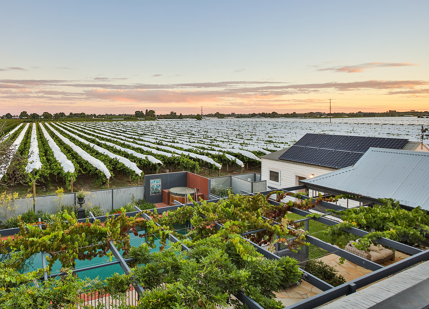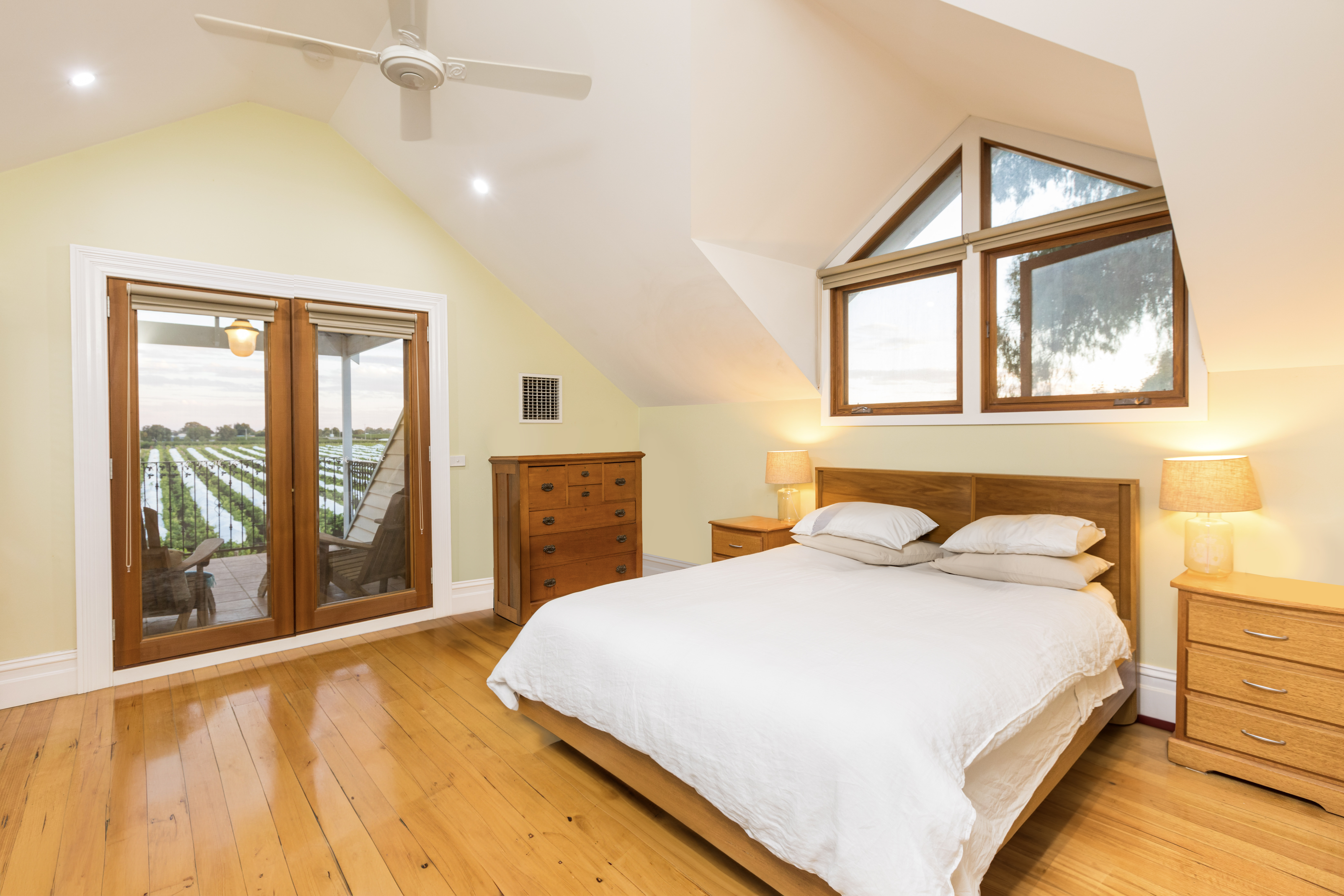 A large master suite upstairs overlooking the neighbouring vineyard from its own balcony.