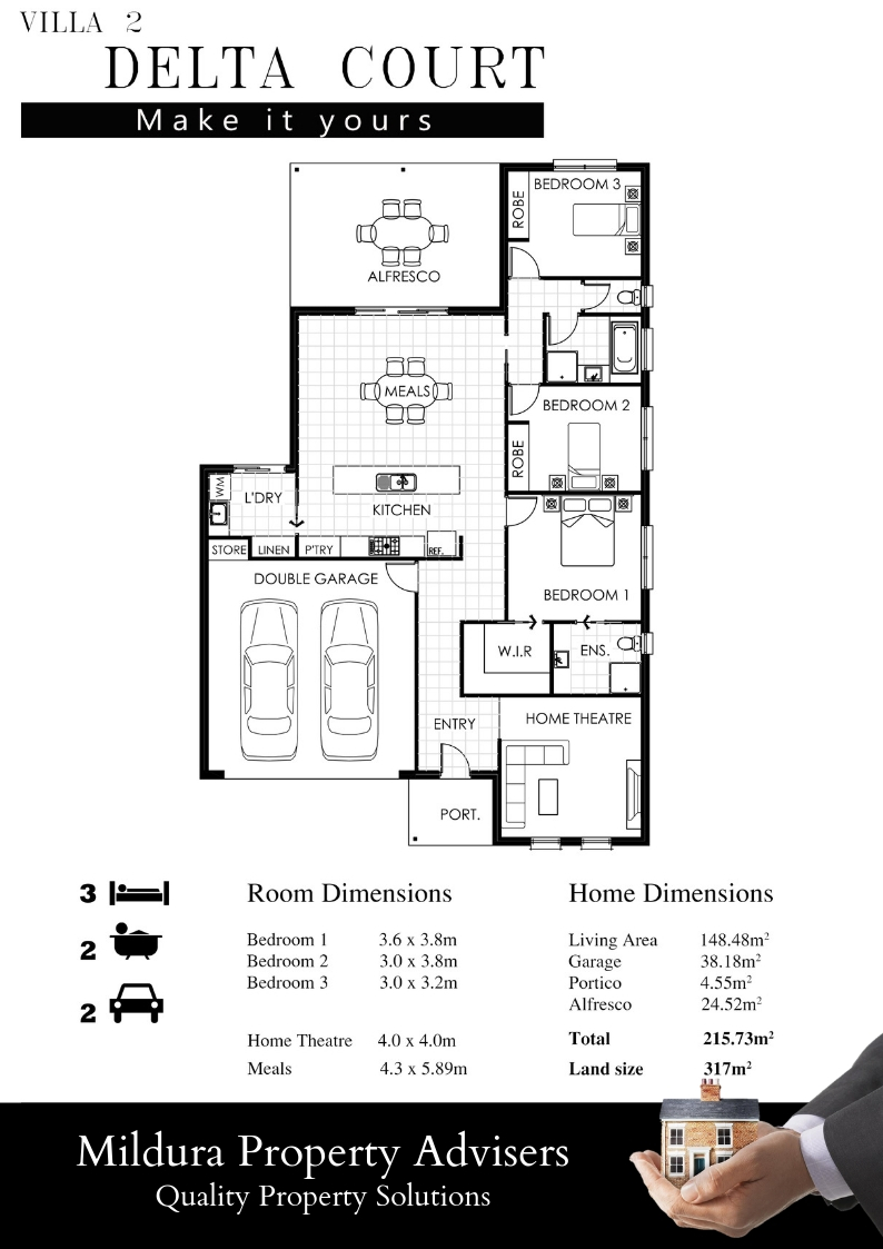 Ideally located only minutes from to Mildura Central Shopping Centre, Ranfurley Primary, Trinity Lutheran College and Mildura Base Hospital, Delta Court Village is perfect for first home owners or investors. Unit 2/7 Delta Court features 3 bedrooms, 2 bathrooms, 2 garage spaces and generous alfresco, ducted reverse cycle, pre-finished laminate cupboard & benchtops, quality fixtures & fittings and red recycled brick vaneer. With a pre-selected colour scheme, all you need to do is sign up. For the astute investor, expected rent of $350 per week for each townhouse.