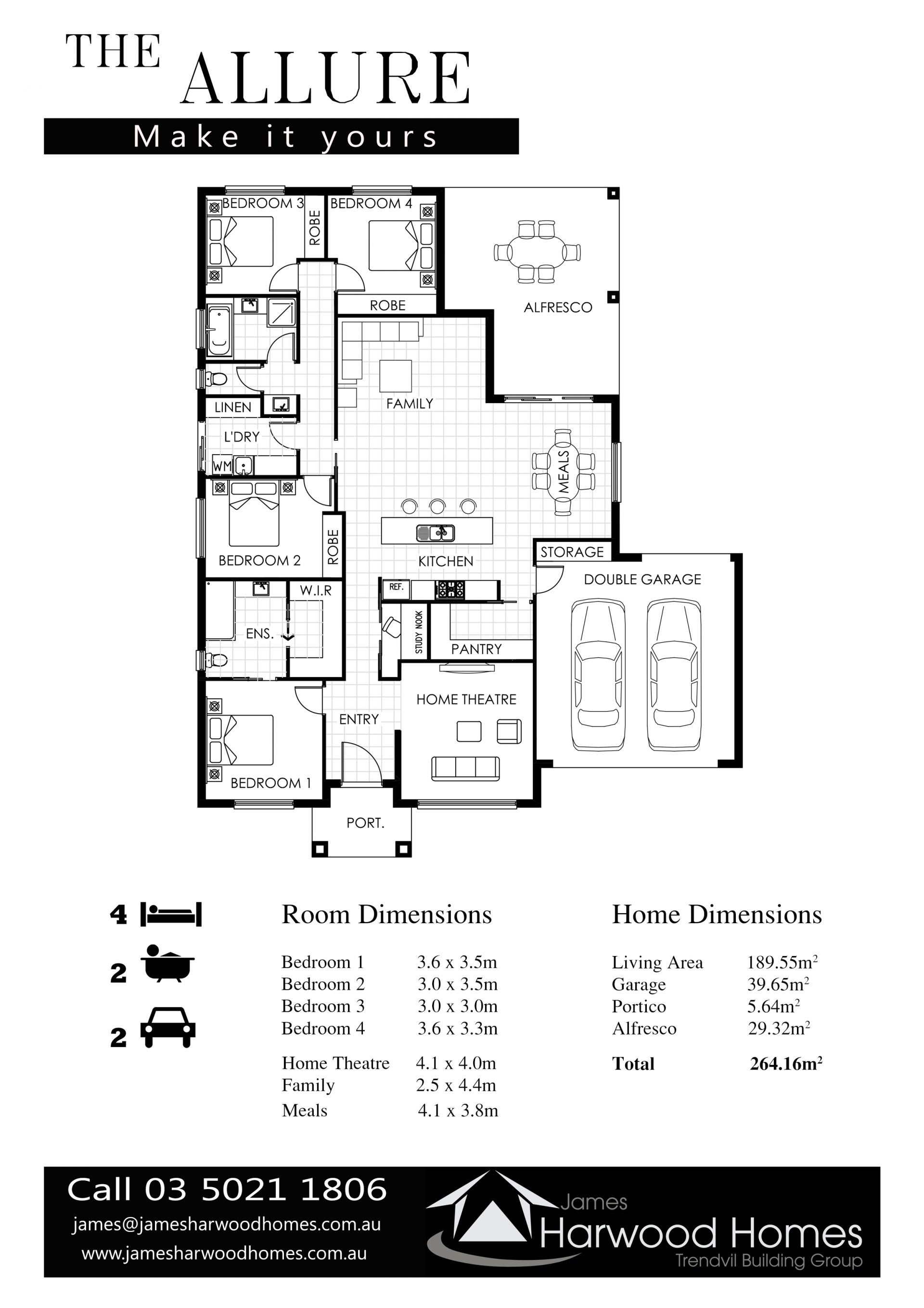 Thinking of building? We have the ideal house and land packages for growing families or first home owners. Located within minutes of preschools, Gol Gol Public School, Gol Gol Hotel and the Murray River, Pine Wood Estate has blocks ranging from 813m2 - 1046m2. Currently sited on Lot 1 is the Allure floor plan, one of James Harwood Homes most popular designs. Featuring 4 bedrooms, 2 bath and large butlers pantry. With 2 separate living areas and a meals leading onto a spacious alfresco this design is perfect for entertaining.
