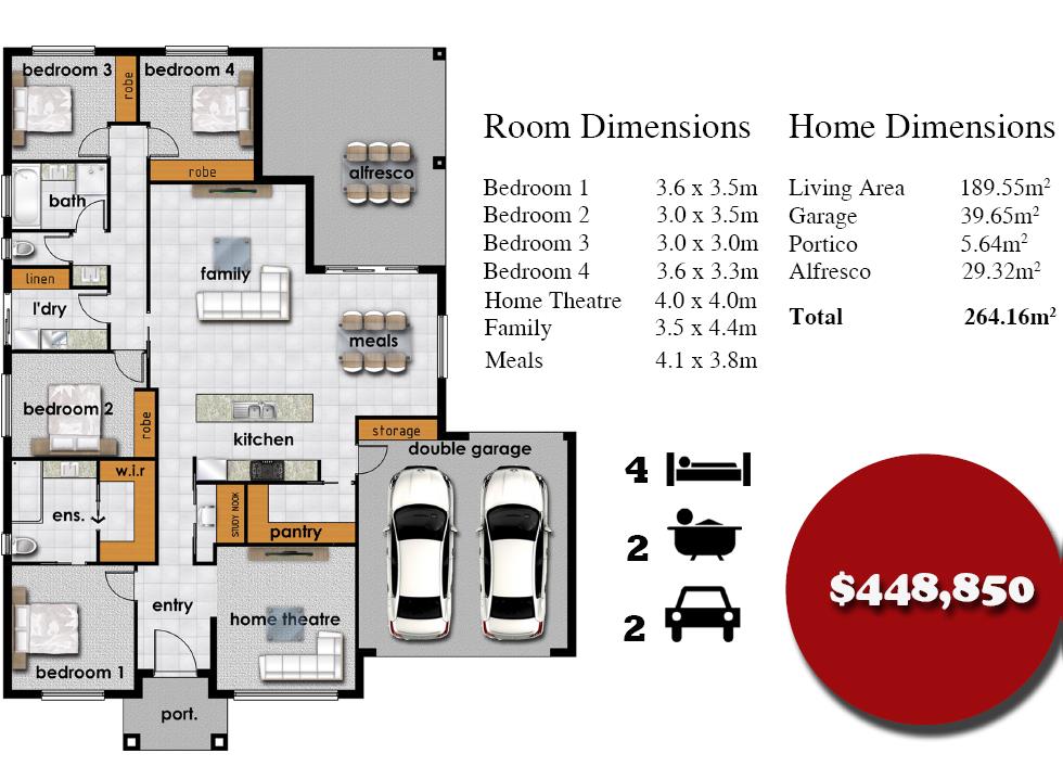 All packages include: Fixed price contract, brick facade, Colorbond roof, Caesar stone bench tops (Kitchen), floor coverings, electrical, reverse cycle air conditioning, solar hot water, landscaping and fencing. House and land packages starting from $448,850 with shed and pool packages available. (Image for illustrative purposes only*)