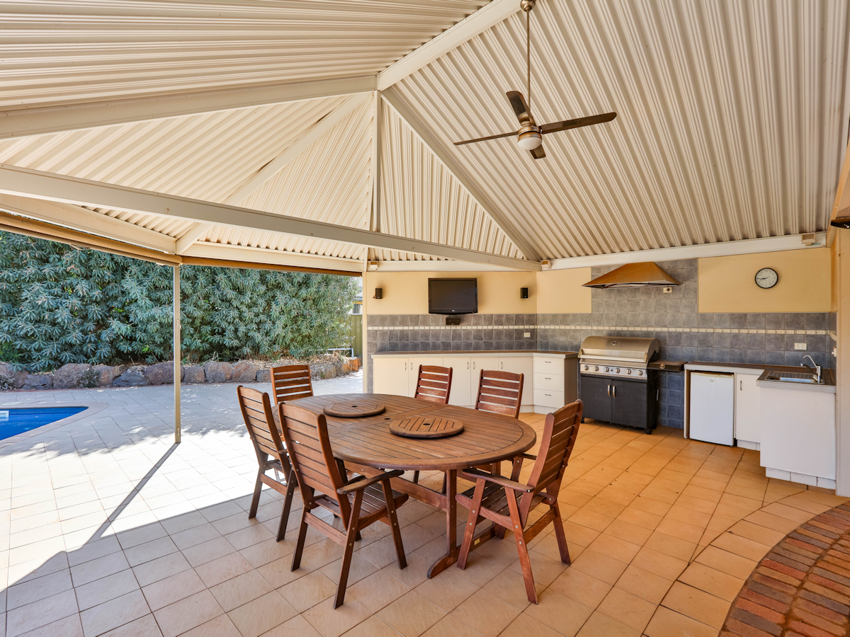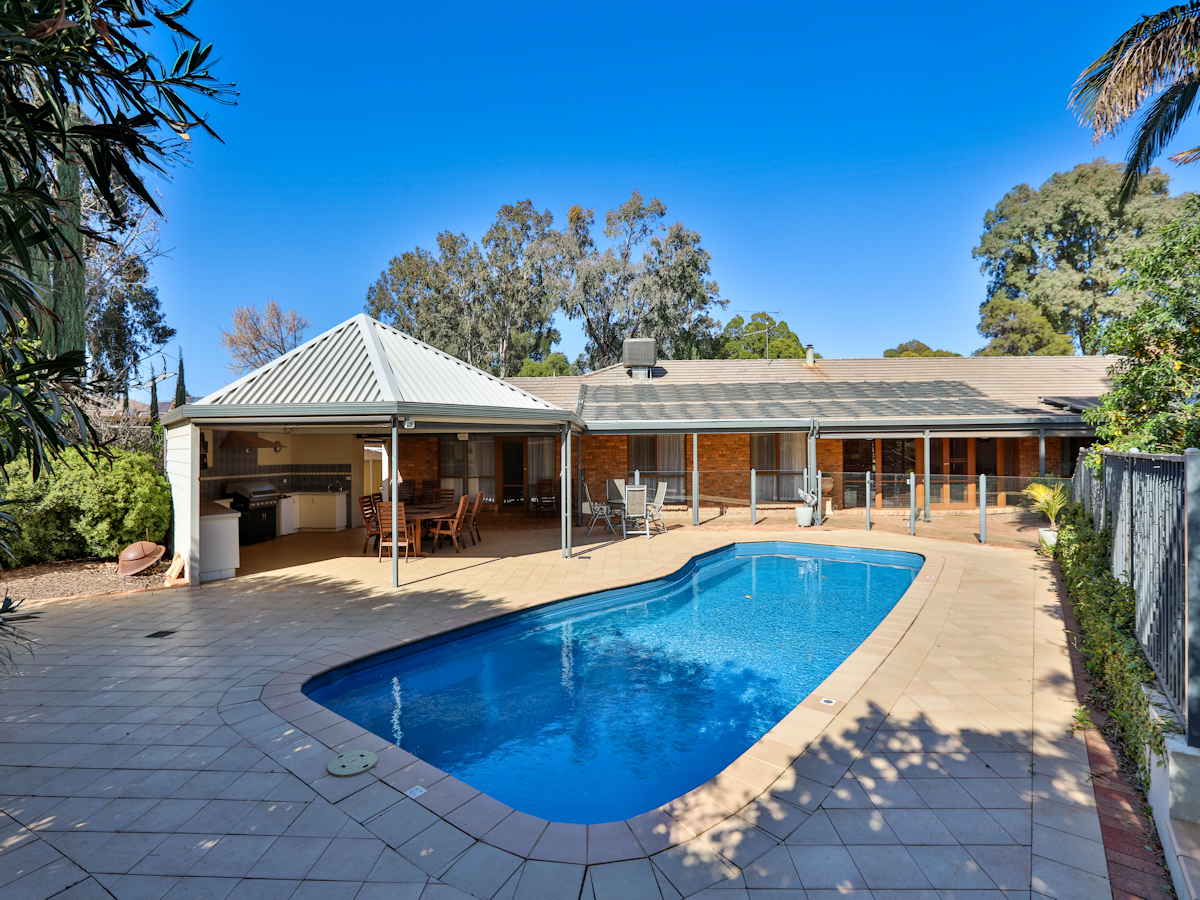 Situated on approx. 2000m2 in one of Mildura's best streets, is this beautiful family home. This huge home offers quality & style throughout with over 30 sq of living. Superbly designed with 3 large living zones; the master bedroom, ensuite and study to one wing; the other wing, ideal for children & guests with 3 more bedrooms, main bathroom and a massive rumpus room. The huge central living area includes a spacious formal living room with Cathedral ceiling, formal dining, open family area plus the beautiful Blackwood timber kitchen (with new appliances & walk in pantry). Outside features a stunning outdoor area with outdoor kitchen, extensive paving and awesome inground pool (heated, salt, self-cleaning), surrounded by stunning landscaped gardens, with a triple garage, shed & 9kw solar!