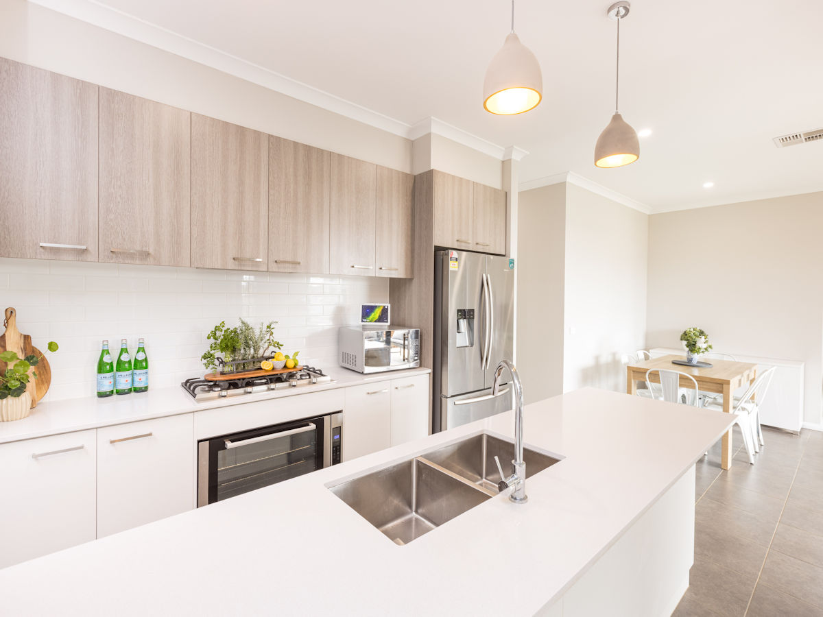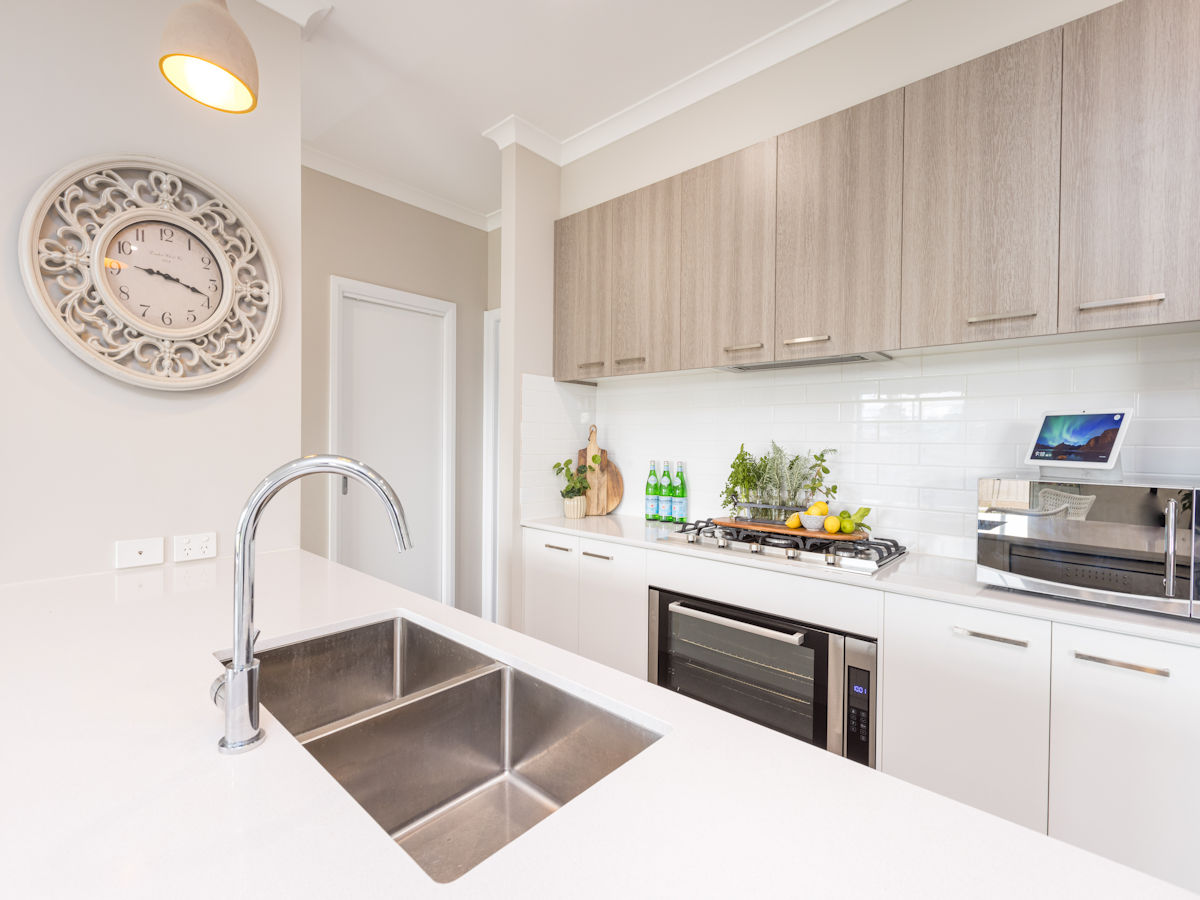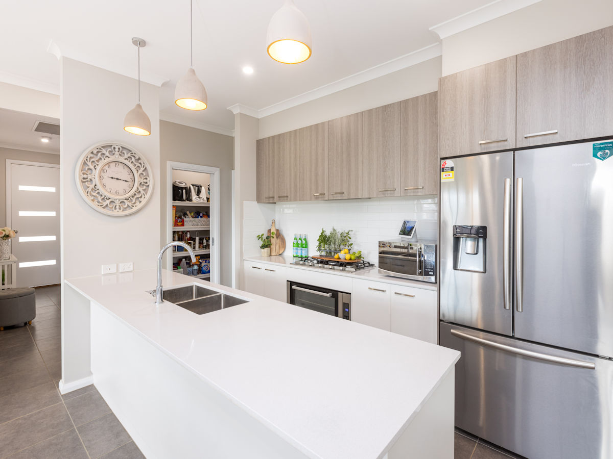 - Kitchen with 20mm stone benches, 900mm Technika cooking appliances, dishwasher, feature pendant lighting and large walk-in pantry